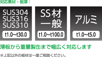 山田製作所では、皆様の様々なご要望にお応えするため、NC シャーリングマシン・NC サーボブレーキ・NC プレスブレーキなどの機器を設置しています。幅広いネットワークであらゆる加工に対応しています。
